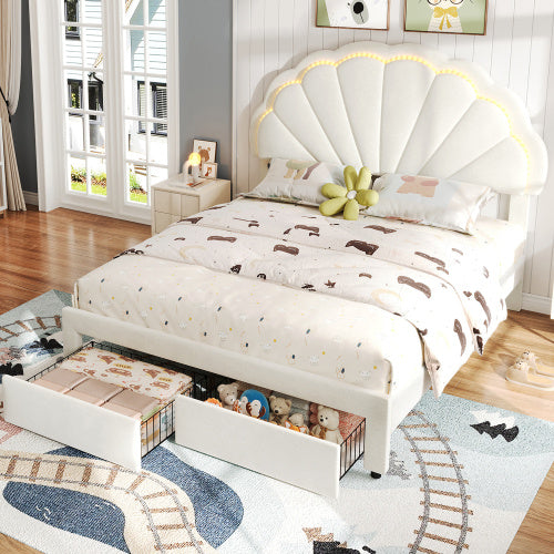Pholstered Bed, Adults Teenagers 4ft6 Double Bed 135x190cm, Shell Shape Backrest, 2 Drawers, Iron Bed Legs, With 16 Colors LED-light Strips, Velvet Iron, Beige